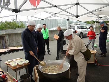 けんちん汁の炊き出し。今回も前回に引き続き、仁叟寺龍源寺檀信徒の皆様方から頂戴いたしました野菜で作らせていただきました。思いが届けば嬉しいです。 |