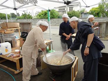 その前日に仁叟寺直心庵にて、檀家の皆様はじめ多数の方々から頂いた野菜の仕込み作業を行い、翌早朝福島に向けて出発しました。 まず、前回及び今回のボランティアの受け入れのご縁を作っていただいた新祥寺様へご挨拶。 その後、避難箇所となっている原町第二中学校及び石神小学校にて必要物資をお渡しし、炊き出し作業を行い、けんちん汁を振舞いました。