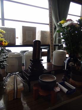 新祥寺様本堂にてお預かりさせていただいているご遺骨です。以前は400霊ほど祀られておられましたが、現在は約50霊ほどだそうです。ちなみに、大震災物故者諸精霊位牌は前回のボランティアにて寄贈申し上げ開眼法要を副住職様に勤めていただきましたお位牌です。 |