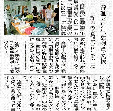 平成23年8月25日、前回・前々回に引き続き、先の東日本大震災で被害にあった福島県南相馬市へ有志を募って第三回目のボランティアに行ってまいりました。(総勢8名参加) 今回は前回までの炊き出しでなく、ボランティアバザーといった形での参加になります。 今回も、炊き出しのボランティアに共に行動をいたしました県内外若手宗侶と共に、ボランティア活動をさせていただきました。