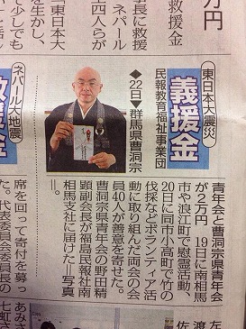 ◆22日◆群馬県曹洞宗青年会と曹洞宗県青年会が2万円 19日に南相馬市や浪江町で慰霊活動、20日に同市小高町で竹の伐採などボランティア活動に取り組んだ両会の会員40人が善意を寄せた。 曹洞宗県青年会の野田精顕副会長が福島民報社南相馬支社に届けた。 |