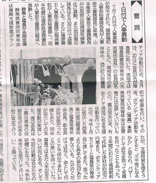 群馬と福島が合同支援 群馬県曹洞宗青年会は復興支援慰霊ボランティア活動の為、5月19,20日に会員23名が福島県に赴いた。現地では福島県曹洞宗青年会(光英覚法会長)の会員23名とともに、南相馬市の新祥寺や、浪江町の慰霊碑前で慰霊を行い、その後、ボランティア活動を行っている。